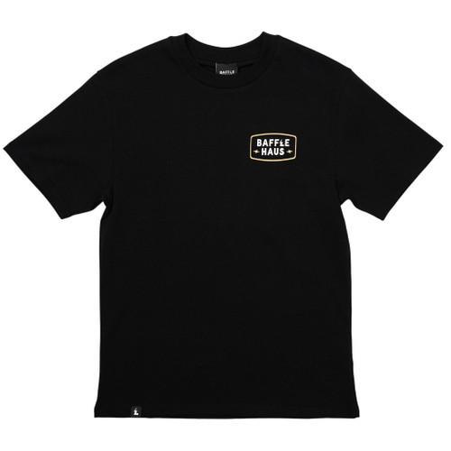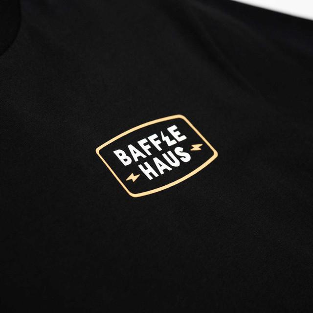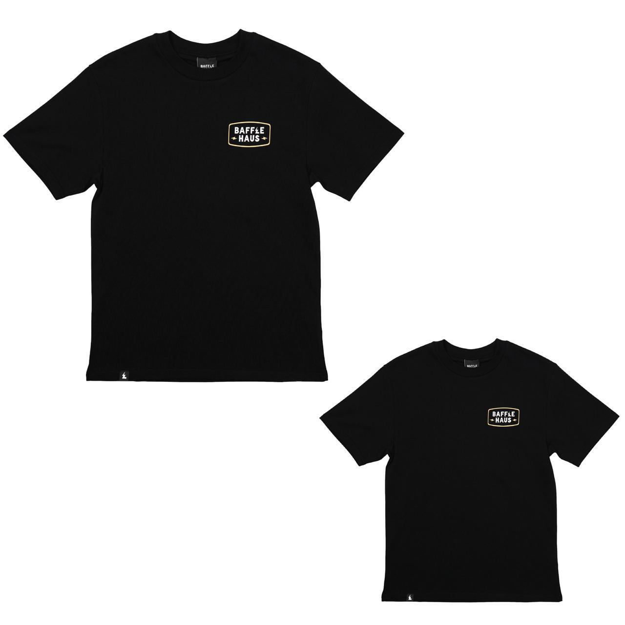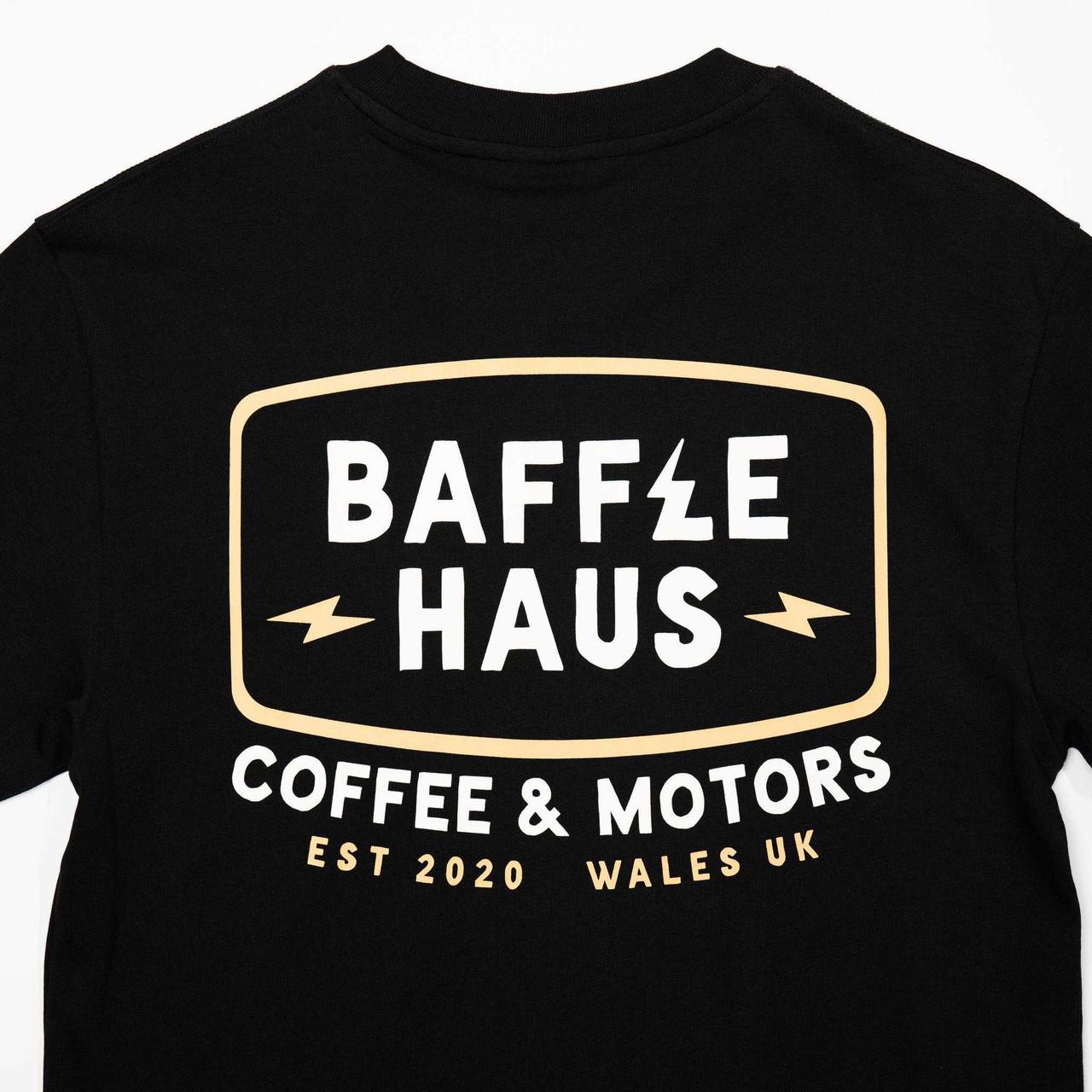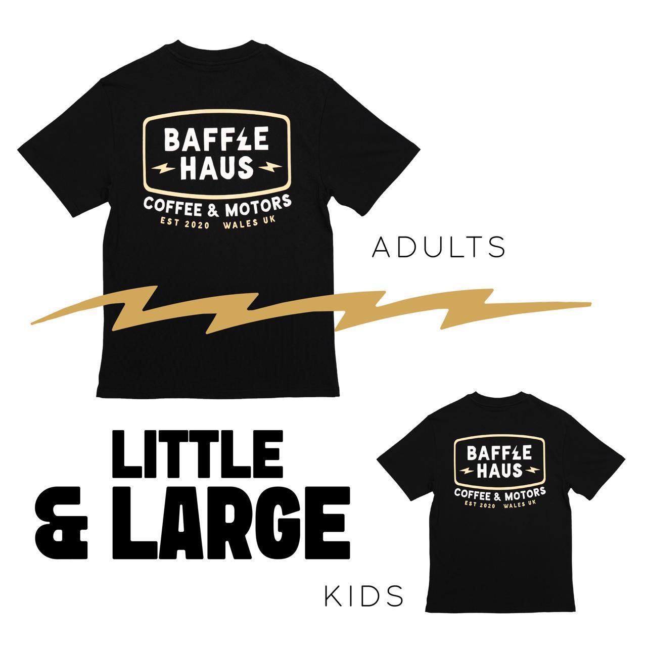 Both are proper black, both carry the Baffle Haus logo on the chest like a badge of honour, and both have "Coffee & Motors" stamped across the back in the sort of lettering that makes other parents at the school gate quietly question their life choices. The adult one fits like your favourite old tee should have done before it shrank in the wash; the kids one is still that same 100% cotton that refuses to turn into sandpaper after three wears.