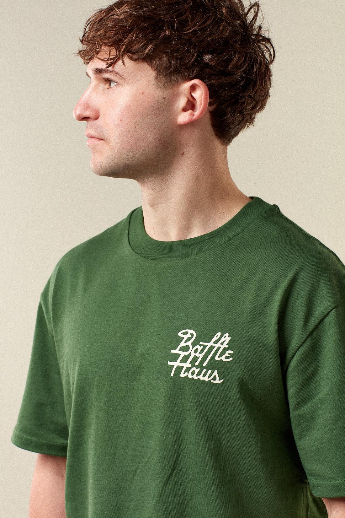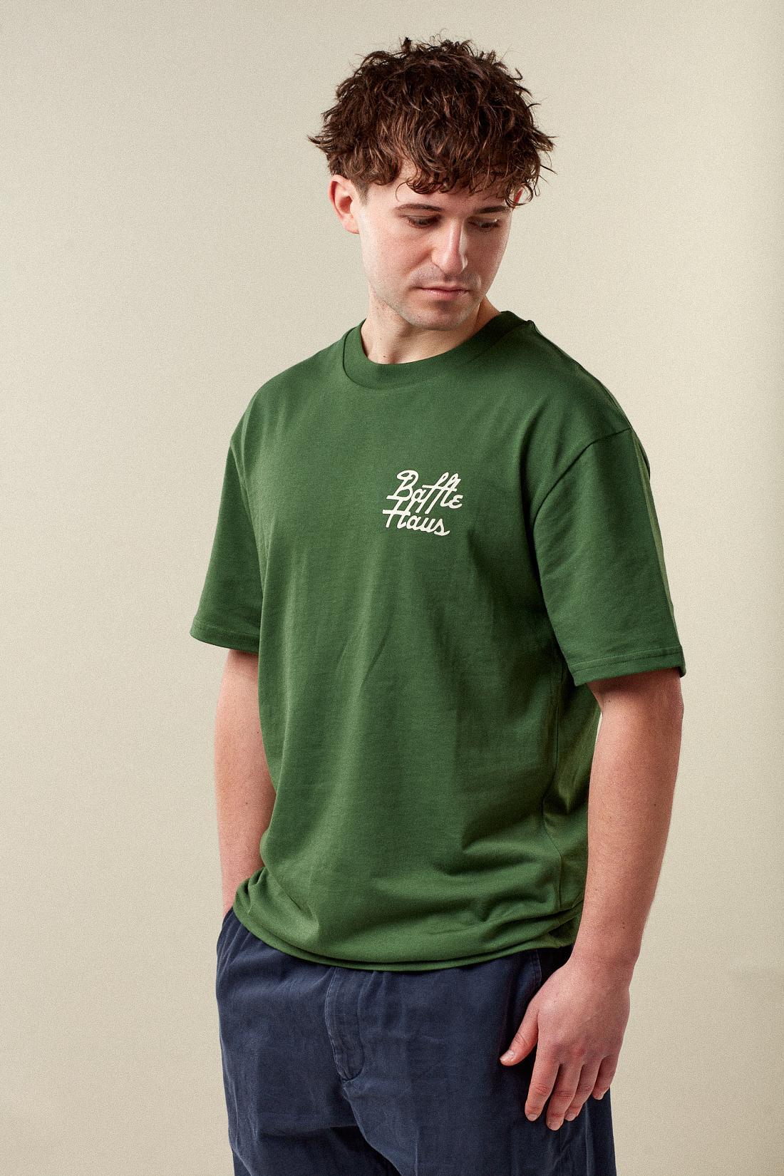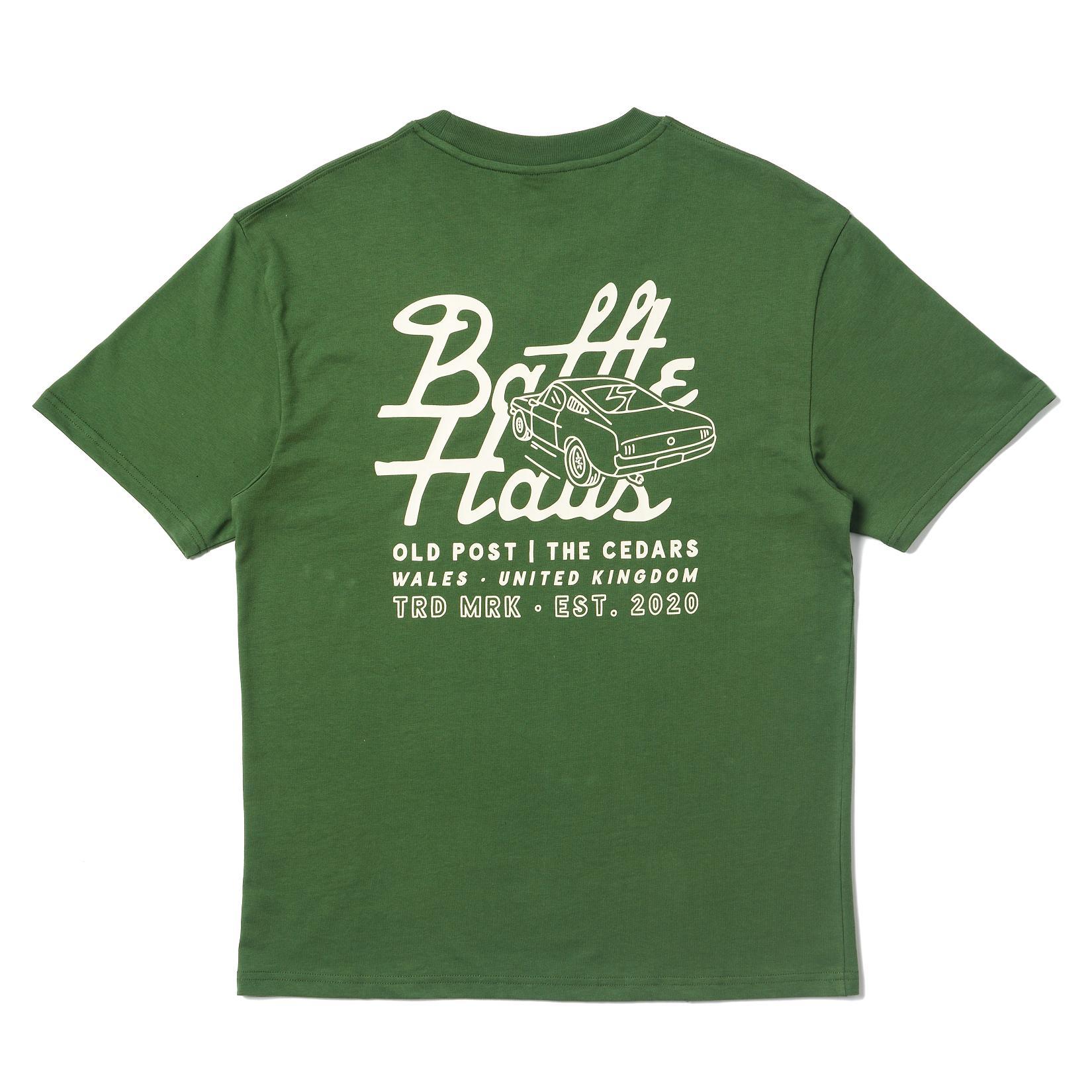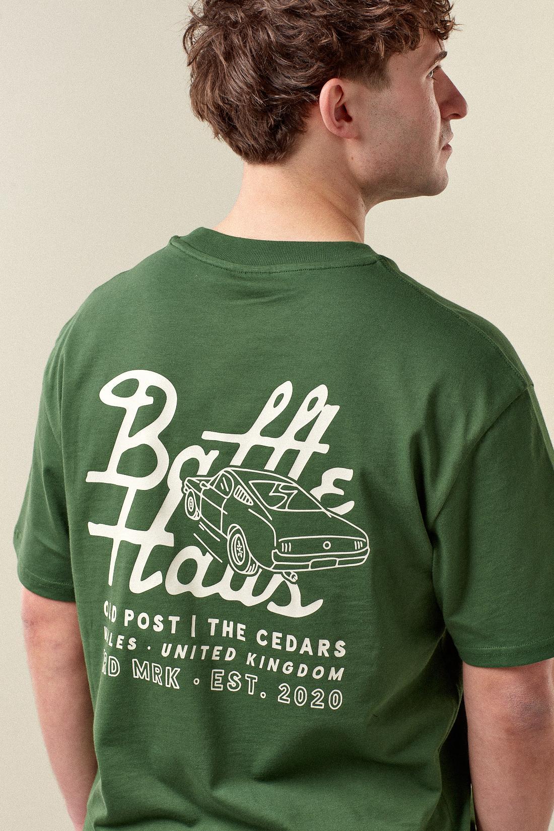 A clean essential built for everyday wear. The Baffle Haus Mustang Tee in Forest Green is crafted from 100% soft cotton, offering a comfortable standard fit.