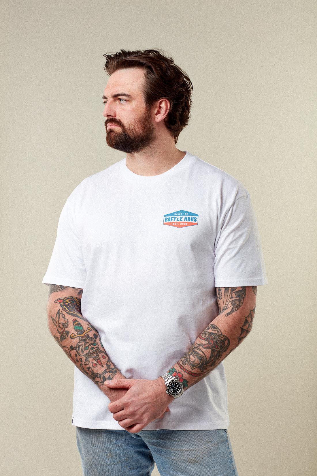 A clean essential built for everyday wear. The Baffle Haus Retro Tee in Crisp White is crafted from 100% soft cotton, offering a comfortable standard fit.