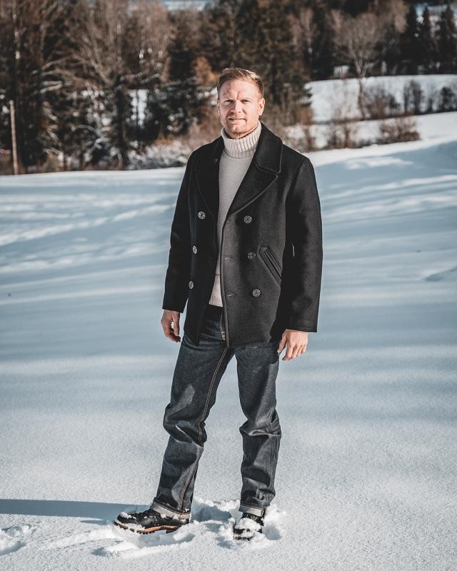 We are proud to produce the Pea Coat in the same heavy wool quality as in the 1930s. The 1000g per square meter fabric is made exclusively for us by a weaving mill in Portugal from 100% virgin wool according to an old recipe. Thanks to its high grammage, the Pea Coat has the same wind and water-repellent properties as the original.