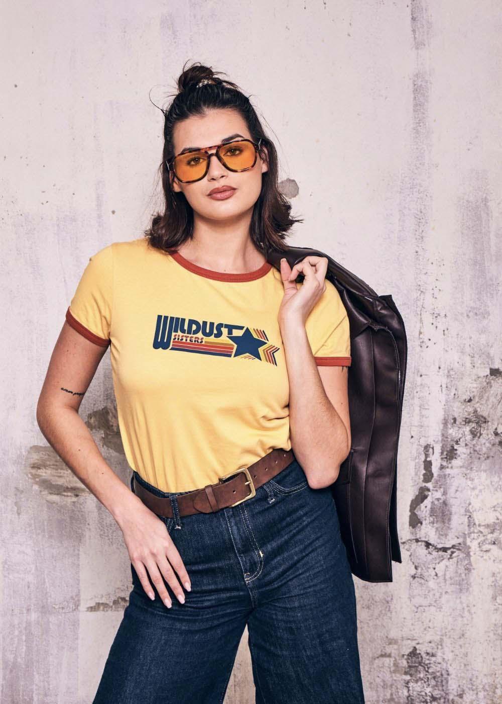 This “Wildust Racing” ringer shirt has that unmistakable seventies feel you hardly ever find anymore: the fitted cut, the contrast trim, that mustard yellow shade that looks like it came straight out of an old archive photo. It captures the spirit of dusty races, sun-scorched roads, and the raw energy of a time when speed meant freedom.