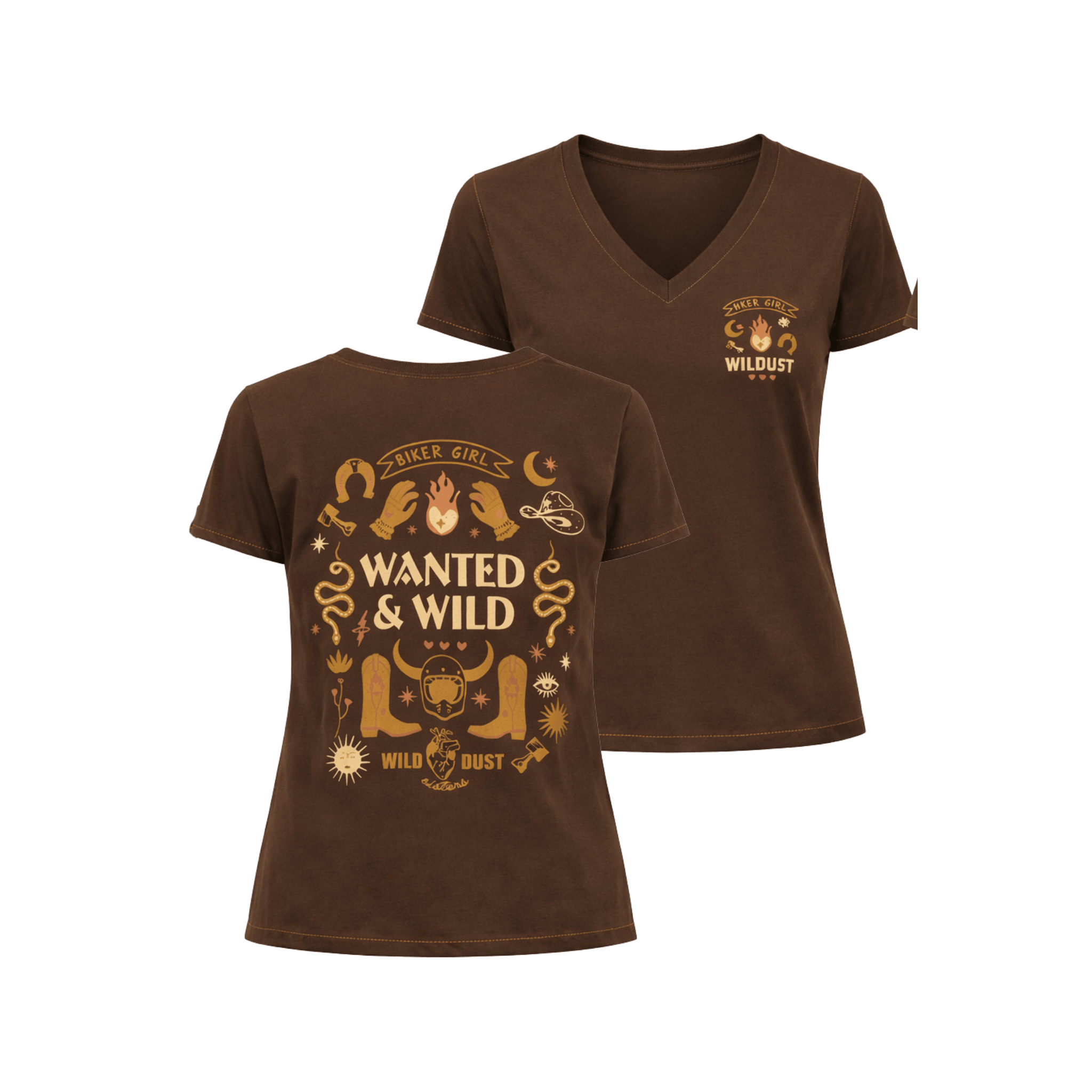 Deep chocolate color, feminine cut with V-neck, and above all a visual on the back that mixes cowgirl symbols, biker references and wild spirit. Between horseshoes, flames and snakes, everything recalls the strength and independence of those who dare to take the road.